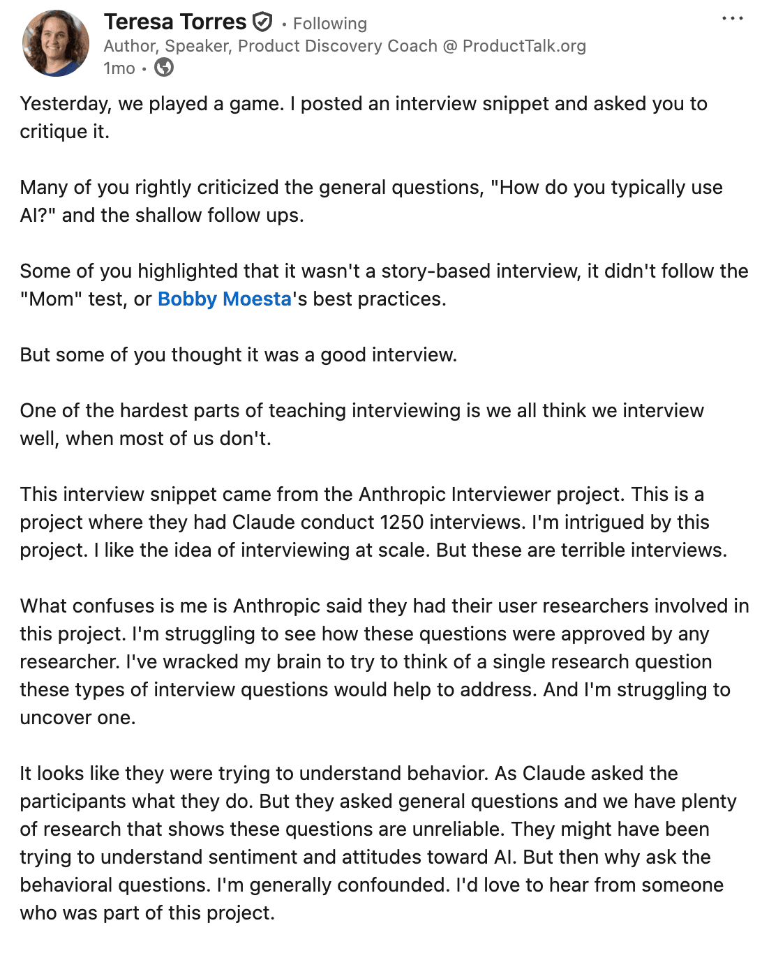 In my coaching practice and workshops, I often discuss the pros and cons of leveraging existing discovery workflows with more efficient and sometimes even more effective AI tools. I believe AI interviewers can help scale your research efforts to a certain point when they are based on high-quality inputs and improve over time. What I think the jury is still out on is: What is the impact on the quality of human responses when they know that they are talking to a machine?